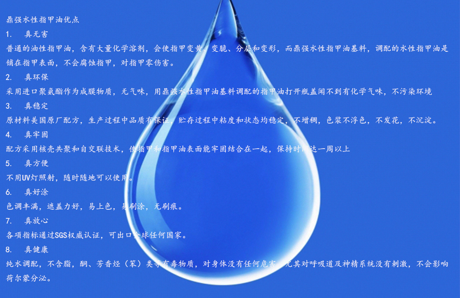 · 5、采用了目前世界新自交聯增強技術,干透后的指甲油膜能形成致密的立體網狀結構。使其耐水性、耐磨性和抗劃傷性都大大提高。